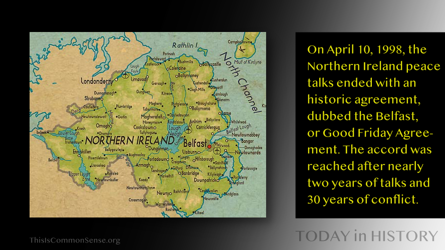 On April 10, 1998, the Northern Ireland peace talks ended with an historic agreement, dubbed the Belfast, or Good Friday Agreement. The accord was reached after nearly two years of talks and 30 years of conflict.