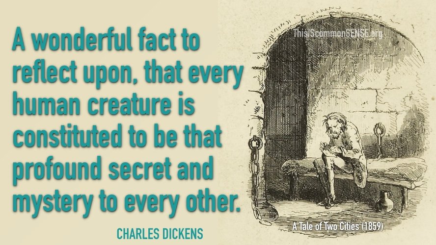 A wonderful fact to reflect upon, that every human creature is constituted to be that profound secret and mystery to every other. A solemn consideration, when I enter a great city by night, that every one of those darkly clustered houses encloses its own secret; that every room in every one of them encloses its own secret; that every beating heart in the hundreds of thousands of breasts there, is, in some of its imaginings, a secret to the heart nearest it!