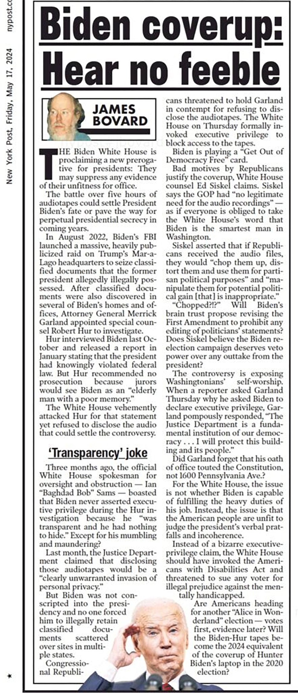 Yesterday, on social media, Mr. Bovard updated the story he covered last year: “The damning audio of President Biden’s disastrous interview with Special Counsel Robert Hur is finally out. Here’s my New York Post oped last year on the BS pretenses the White House used to suppress the tape. Biden was not even sure if Trump was elected president in 2017 or in 2016.”