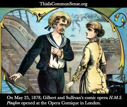 On May 25, 1878, Gilbert and Sullivan’s comic opera H.M.S. Pinafore opened at the Opera Comique in London. (Image is a detail from an 1879 theater poster.)