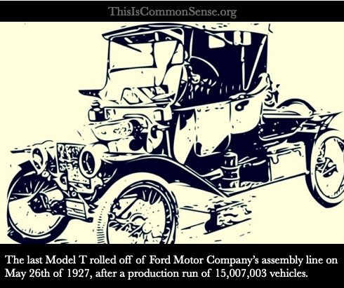- The last Model T rolled off of Ford Motor Company’s assembly line on May 26th of 1927, after a production run of 15,007,003 vehicles.
