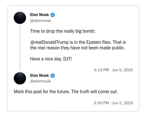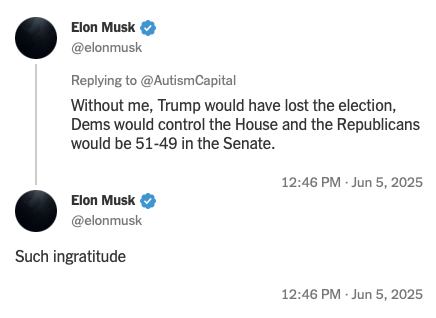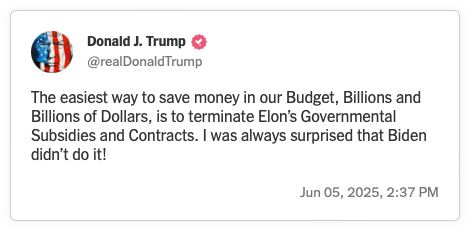 But then things got weird. As summarized by The New York Times, the schism played out first at the White House, as “Mr. Trump said that Mr. Musk, the billionaire leader of Tesla and SpaceX, was ‘upset’ that the pending legislation would roll back subsidies for electric vehicles. Then he got in a particularly sharp jab, asserting he would have won the 2024 election without the millions of dollars Mr. Musk spent to support him.” Then it went mostly to social media (X and Truth Social):