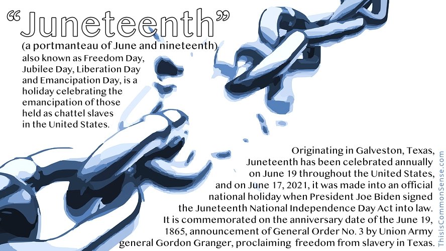 “Juneteenth” (a portmanteau of June and nineteenth) also known as Freedom Day, Jubilee Day, Liberation Day and Emancipation Day, is a holiday celebrating the emancipation of those held as chattel slaves in the United States. Originating in Galveston, Texas, it has been celebrated annually on June 19 throughout the United States, and on June 17, 2021, it was made into an official national holiday when President Joe Biden signed the Juneteenth National Independence Day Act into law. It is commemorated on the anniversary date of the June 19, 1865, announcement of General Order No. 3 by Union Army general Gordon Granger, proclaiming freedom from slavery in Texas.