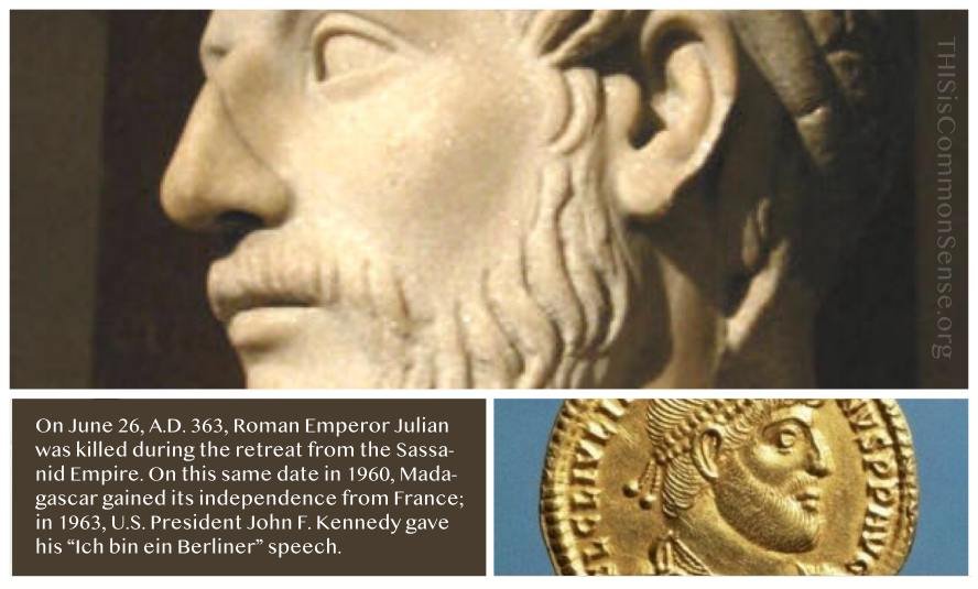 On June 26, 363, Roman Emperor Julian was killed during the retreat from the Sassanid Empire. On this same date in 1960, Madagascar gained its independence from France; in 1963, U.S. President John F. Kennedy gave his “Ich bin ein Berliner” speech.