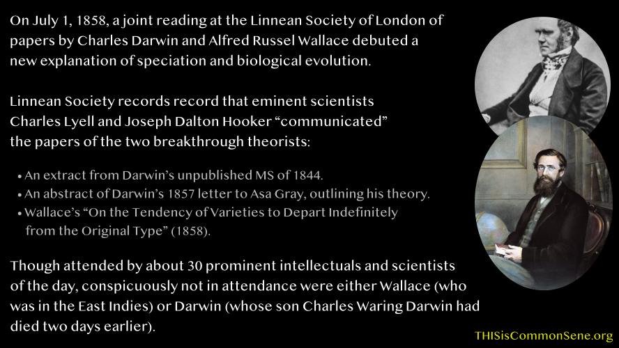 On July 1, 1858, a joint reading at the Linnean Society of London of papers by Charles Darwin and Alfred Russel Wallace debuted a new explanation of speciation and biological evolution.