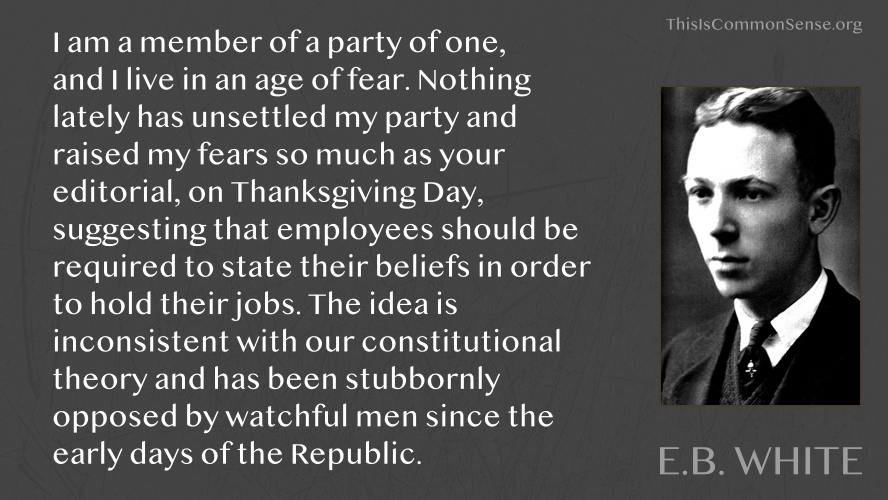 I am a member of a party of one, and I live in an age of fear. Nothing lately has unsettled my party and raised my fears so much as your editorial, on Thanksgiving Day, suggesting that employees should be required to state their beliefs in order to hold their jobs. The idea is inconsistent with our constitutional theory and has been stubbornly opposed by watchful men since the early days of the Republic.