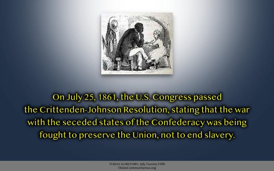 On July 25, 1861, the U.S. Congress passed the Crittenden-Johnson Resolution, stating that the war with the seceded states of the Confederacy was being fought to preserve the Union, not to end slavery.
