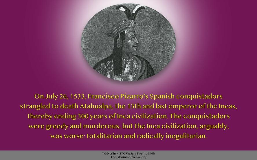 On July 26, 1533, Francisco Pizarro’s Spanish conquistadors strangled to death Atahualpa, the 13th and last emperor of the Incas, thereby ending 300 years of Inca civilization. The conquistadors were greedy and murderous, but the Inca civilization, arguably, was worse: totalitarian and radically inegalitarian. But they made great high-mountain roads. (Arguments about infrastructure promoted by Big Government continue to this very day. And it is quite possible that an earlier civilization made the roadways, which the Inca merely renovated.)