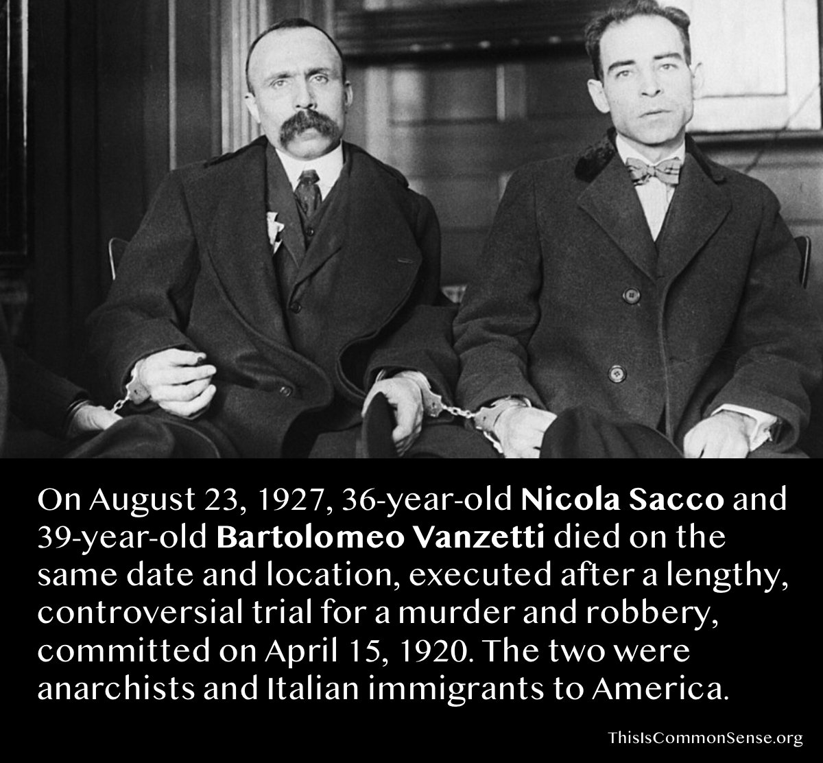 On Tuesday, August 23, 1927, 36-year-old Nicola Sacco and 39-year-old Bartolomeo Vanzetti died on the same date and at the same location, executed after a lengthy, controversial trial for a murder and robbery, committed on April 15, 1920. The two were anarchists and Italian immigrants to America. The means of execution was the electric chair for both; the times of execution were between noon and 12:30 on that Tuesday.