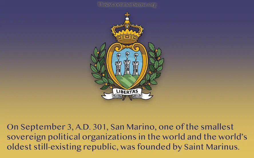 On September 3, A.D. 301, San Marino, one of the smallest sovereign political organizations in the world and the world’s oldest still-​existing republic, was founded by Saint Marinus.