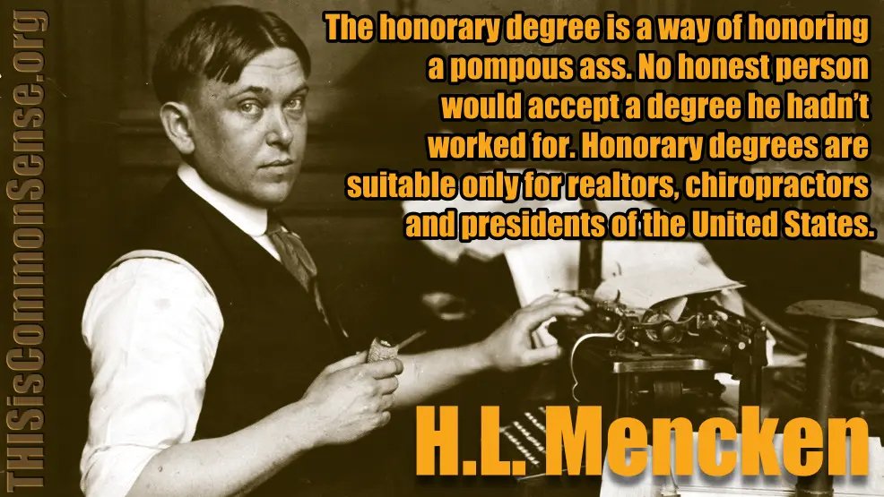 The honorary degree is a way of honoring a pompous ass. No honest person would accept a degree he hadn’t worked for. Honorary degrees are suitable only for realtors, chiropractors and presidents of the United States.
