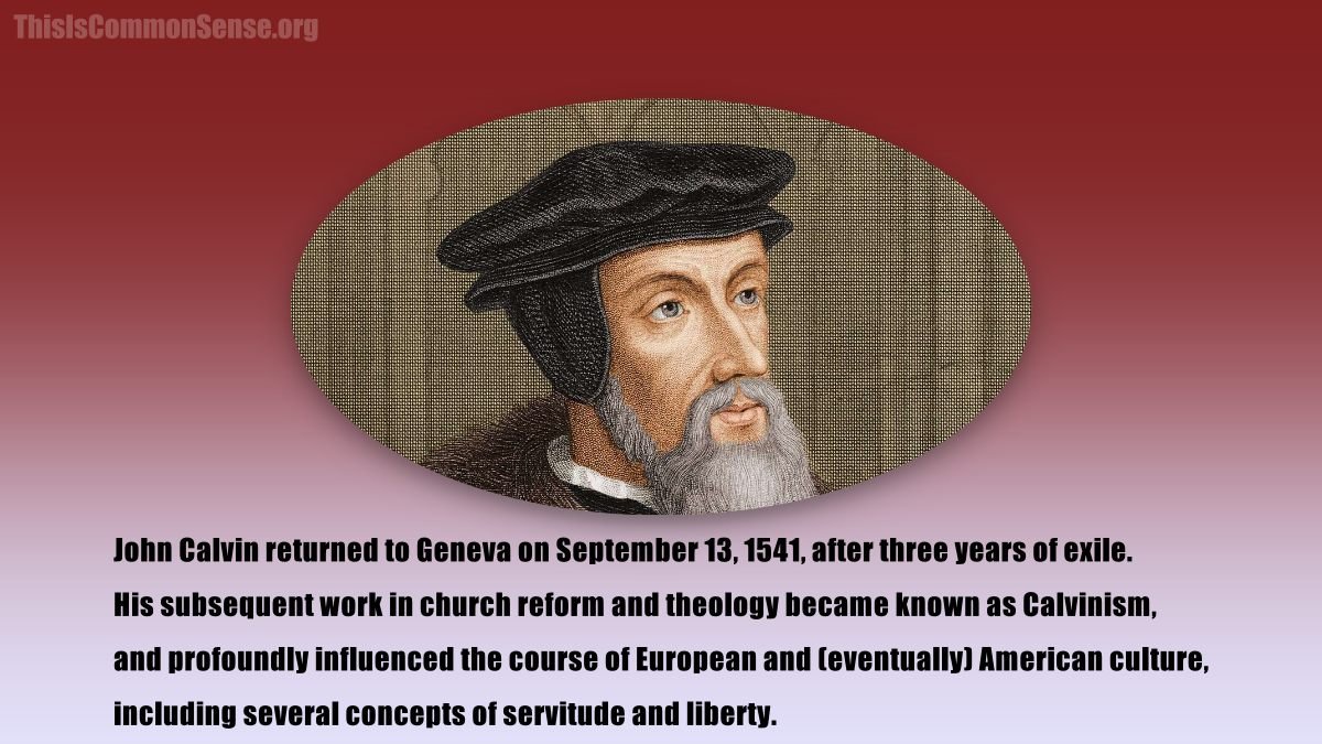 John Calvin returned to Geneva on September 13, 1541, after three years of exile. His subsequent work in church reform and theology became known as Calvinism, and profoundly influenced the course of European and (eventually) American culture, including several concepts of servitude and liberty.