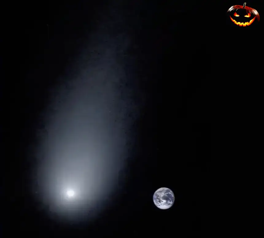 As previously mentioned in these updates, the comet may not even be a comet since it is so weird. And it is so weird that Harvard astrophysicist Avi Loeb has had a field day on newscasts and podcasts speculating on the possibility that the object may be artificial in origin. YouTube is filled with both rational discussion and outrageous hype about this extremely odd interstellar mass, with talk of alien machinery, etc. And is it worth noting that the object will be invisible to us on Halloween day? (See illustration, above, for a chuckle.)