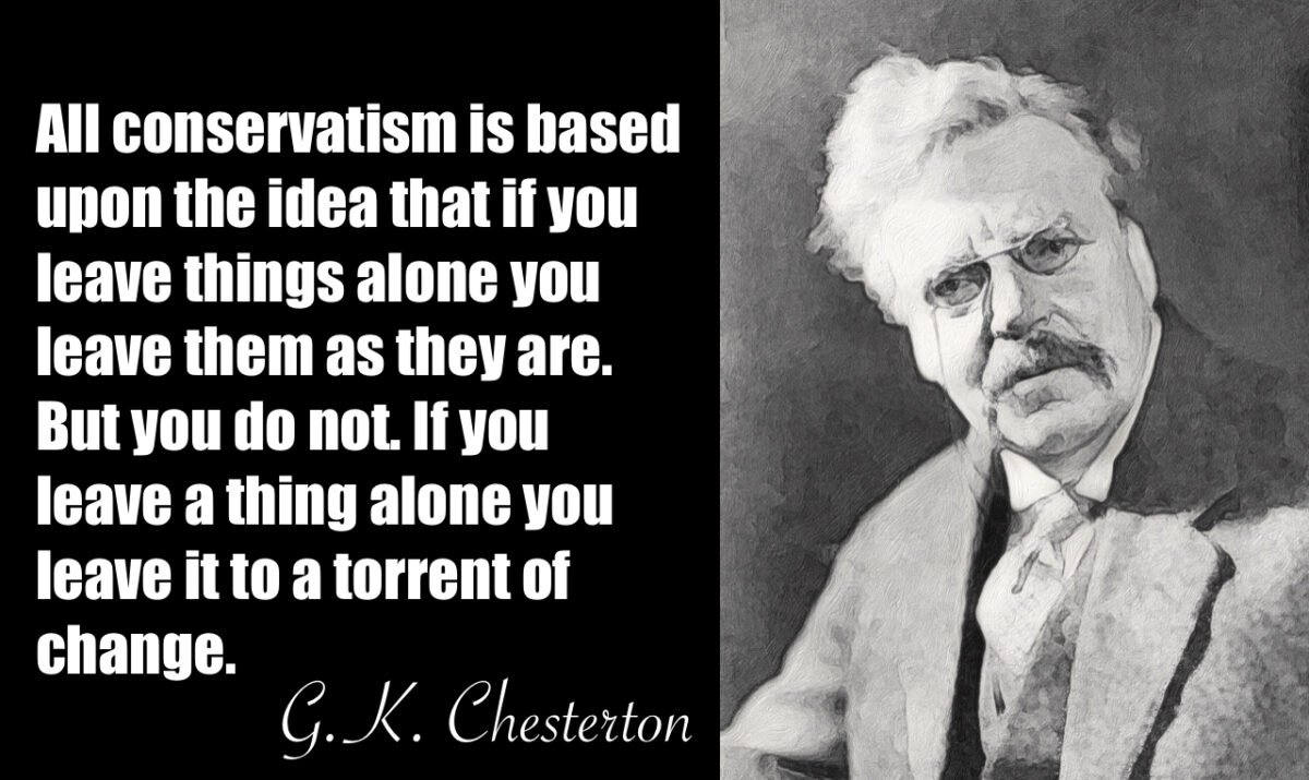 “The whole modern world has divided itself into Conservatives and Progressives. The business of Progressives is to go on making mistakes. The business of Conservatives is to prevent mistakes from being corrected. Even when the revolutionist might himself repent of his revolution, the traditionalist is already defending it as part of his tradition. Thus we have two great types — the advanced person who rushes us into ruin, and the retrospective person who admires the ruins. He admires them especially by moonlight, not to say moonshine. Each new blunder of the progressive or prig becomes instantly a legend of immemorial antiquity for the snob. This is called the balance, or mutual check, in our Constitution.” (Illustrated London News 19 April 1924)
