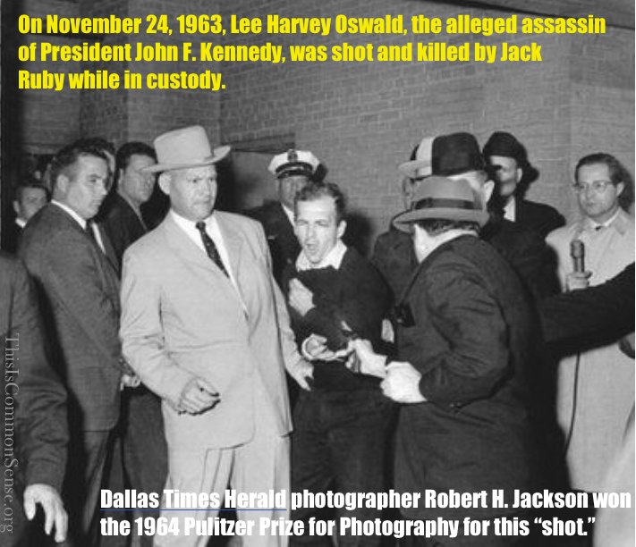 On November 24, 1963, Lee Harvey Oswald, the alleged assassin of President John F. Kennedy, was shot and killed by Jack Ruby while in custody.
