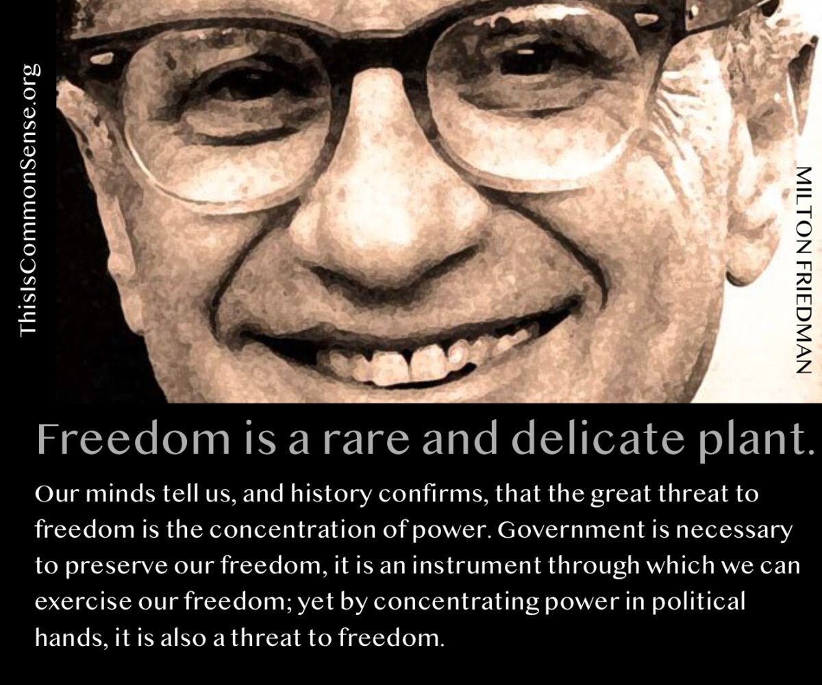 The free man will ask neither what his country can do for him nor what he can do for his country. He will ask rather ‘What can I and my compatriots do through government’ to help us discharge our individual responsibilities, to achieve our several goals and purposes, and above all, to protect our freedom? And he will accompany this question with another: How can we keep the government we create from becoming a Frankenstein that will destroy the very freedom we establish it to protect? Freedom is a rare and delicate plant. Our minds tell us, and history confirms, that the great threat to freedom is the concentration of power. Government is necessary to preserve our freedom, it is an instrument through which we can exercise our freedom; yet by concentrating power in political hands, it is also a threat to freedom. Even though the men who wield this power initially be of good will and even though they be not corrupted by the power they exercise, the power will both attract and form men of a different stamp.