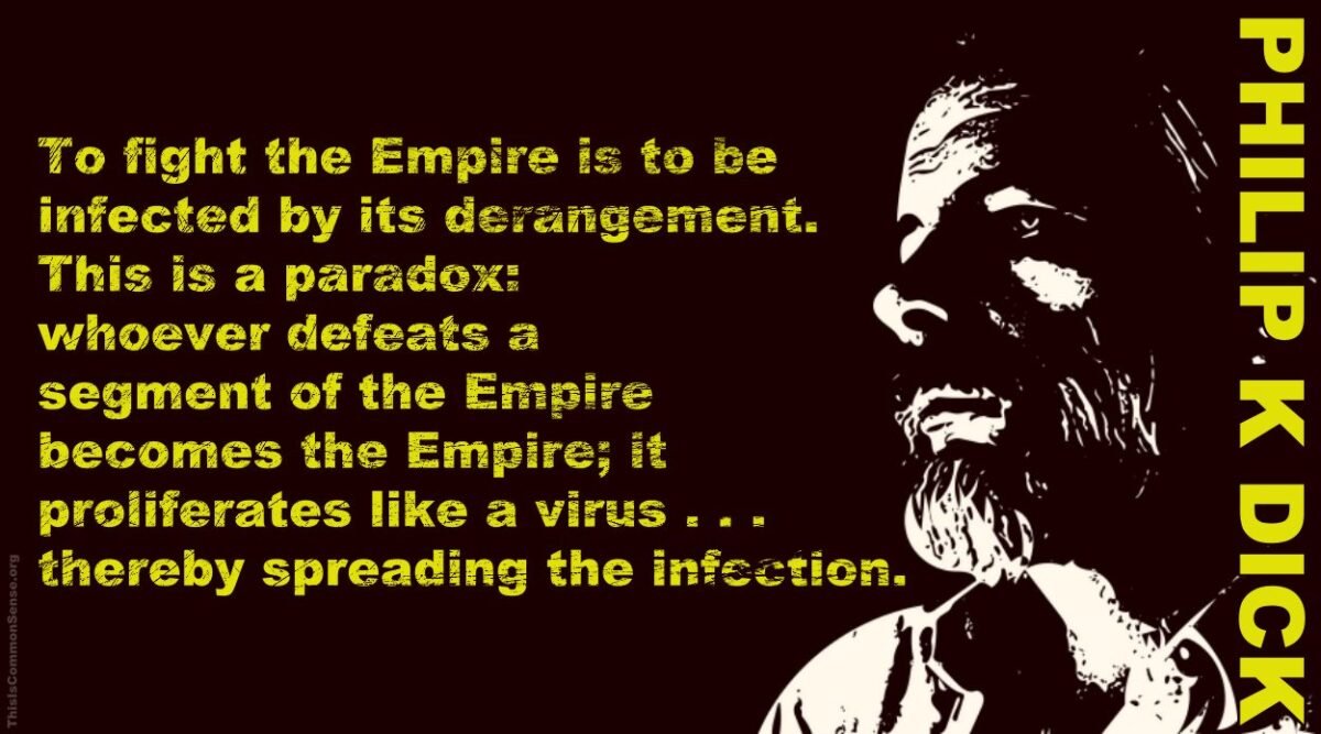 To fight the Empire is to be infected by its derangement. This is a paradox: whoever defeats a segment of the Empire becomes the Empire; it proliferates like a virus … thereby spreading the infection.