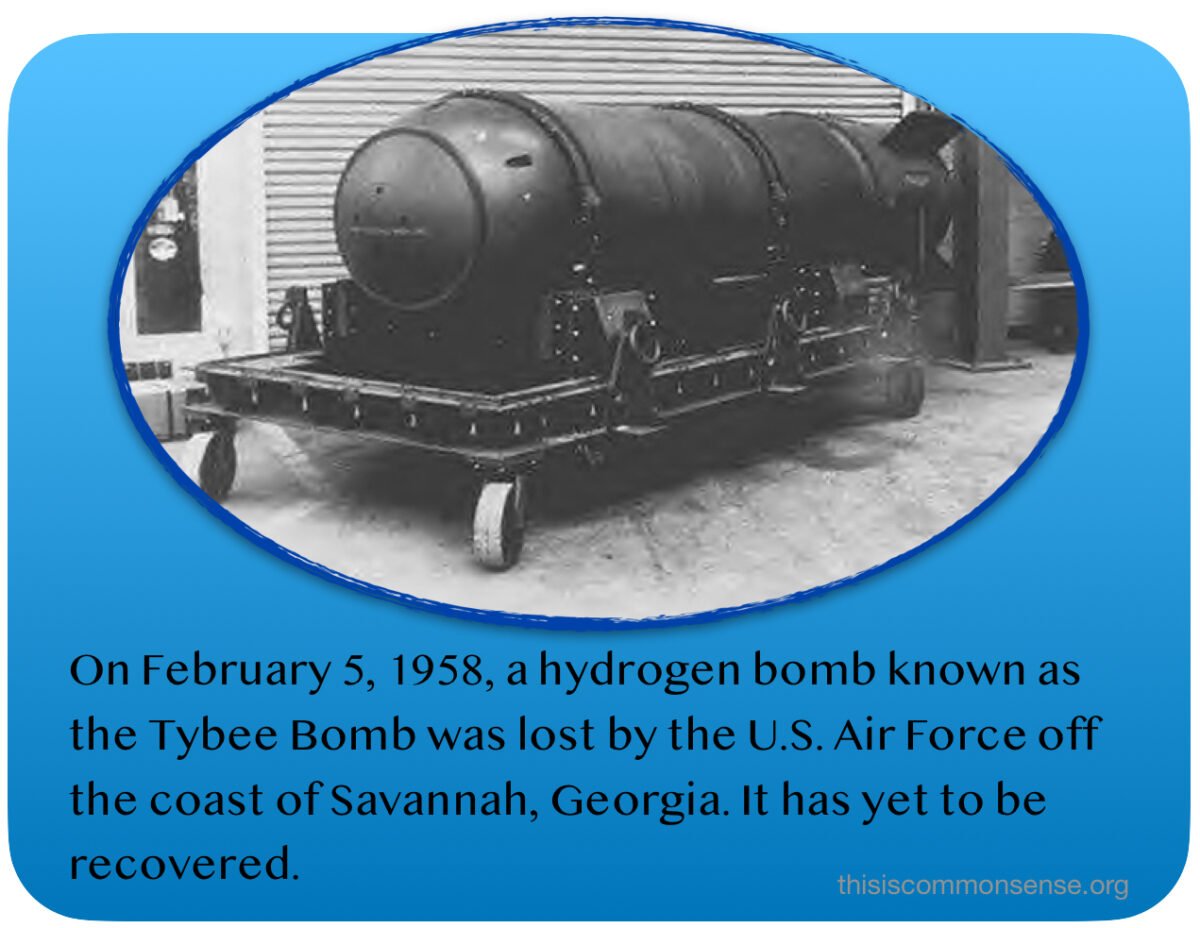 On February 5, 1958, a hydrogen bomb known as the Tybee Bomb was lost by the U.S. Air Force off the coast of Savannah, Georgia. It has yet to be recovered.