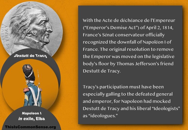 With the Acte de déchéance de l’Empereur (“Emperor’s Demise Act”) of April 2, 1814, France’s Sénat conservateur officially recognized the downfall of Napoléon I of France. The original resolution to remove the Emperor was moved on the legislative body’s floor by Thomas Jefferson’s friend Destutt de Tracy* and was drawn up by Charles Lambrechts. The final paragraph summarized the new reality concisely: