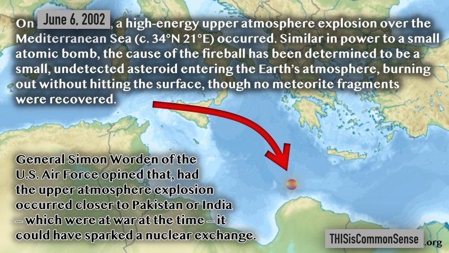 On June 6, 2002, a high-energy upper atmosphere explosion over the Mediterranean Sea (c. 34°N 21°E) occurred. Similar in power to a small atomic bomb, the cause of the fireball has been determined to be a small, undetected asteroid entering the Earth’s atmosphere and burning out without hitting the surface, though no meteorite fragments were recovered. One of the several meanings of the word “bolide” is this, an atmospheric explosion of a meteor.
