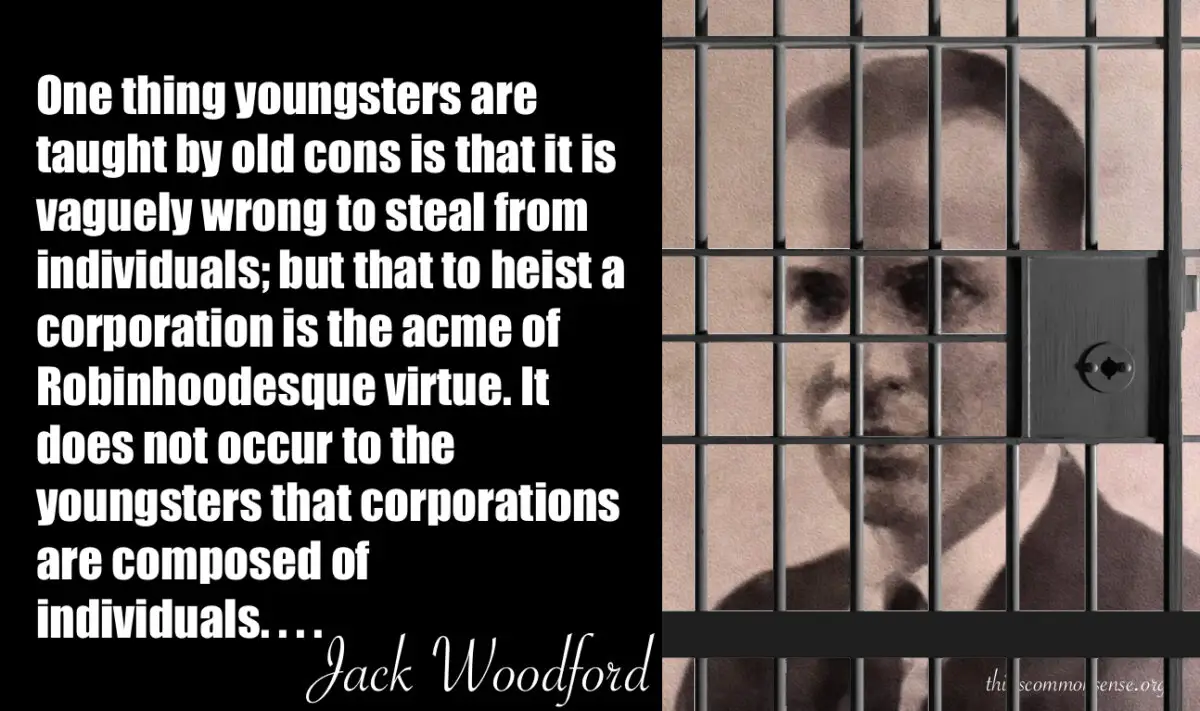 For instance, one thing youngsters are taught by old cons is that it is vaguely wrong to steal from individuals; but that to heist a corporation is the acme of Robinhoodesque virtue. It does not occur to the youngsters that corporations are composed of individuals.…